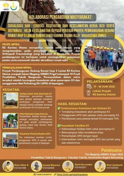 Kolaborasi Pengabdian Masyarakat: Sosialisasi dan Edukasi K3 serta Distribusi Helm Keselamatan di Proyek RS Karima Utama Oleh Mahasiswa UNNES
